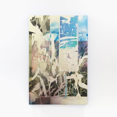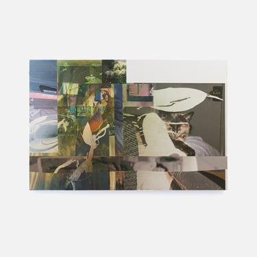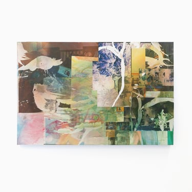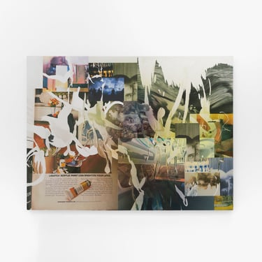 Despite his meticulous control over gestures of placement and displacement, the most gestural dimension of the works emerges from an act of surrender to the materiality of his processes. What appear to be deliberate gashes and streaks of white across the surfaces of the paintings begin as bubbles where the prints did not fully adhere to the surface. That nothing quite sticks, not all the way anyway; that things don't quite fit or sit; that everything accrues as marks on a surface, even erasures and excisions; these become the starting points for a series of gestures which resolve ultimately under the finely tuned reworking of a set of accidents, which remain variously raw or incorporated under skeins, mists, and smears of a opalescence.