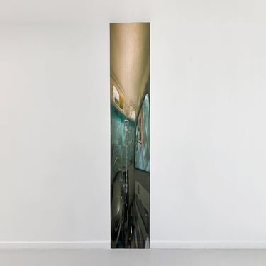 He works with an inherited large format printer whose age and disuse has caused a range of miscalibrations that result in color distortions and banding reminiscent of the field distortions of well worn analog video. These bands recur in patches across the surfaces of the paintings, sometimes reoriented vertically or inverted, so that the entire experience of space in the exhibition seems at times to vibrate under the same prismatic iridescence. This sense of hazy continuity is offset by the stark assertion of edges and angles in the installation as well as in the paintings, so that pockets of intense flatness and vertiginous depth seem to slide against each other, puncturing and punctuating space, sometimes serrating it to the point of becoming rhythmic.
