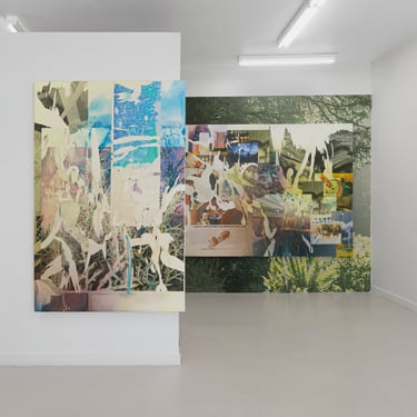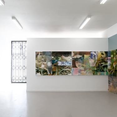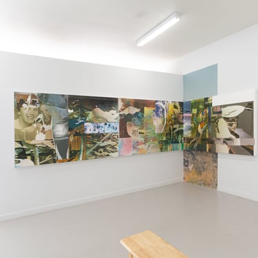 Parts of some whole includes five paintings which form two sets. One is a triptych of horizontally oriented panels hinged across the front corner of the gallery space. The other is a displaced diptych, with a larger panel centered on the recessed wall at the back of the gallery, and a second smaller panel slightly overhanging the edge of the parallel wall in the main portion of the gallery. Both sets of panels are partially backed by sections of textured vinyl wallpaper, which Hunt has printed with hyper-enlarged images selected from the set of photographs that form the material and ground of his paintings.
