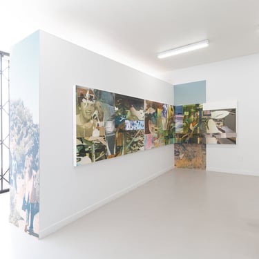 Along with his inherited printer, Hunt also works with inherited images, family photographs, as well as fragments of mass cultural symbols like the Marlboro man, already filtered through Richard Prince's appropriations, or the cover of Art in America and Time Magazine. The most striking and strikingly photographic image in the show is a picture of two young women in the left panel of the triptych whose knowing and mischievous gazes capture us with a certainty that feels impossible to return. It is all the more striking an illusion because it is not us but themselves that they glimpse in the two way mirror of a photo booth. The young woman on the right is Hunt's grandmother. You wouldn't know it from looking at his earlier work, but for years most of it was constructed from a single photograph of his grandmother's desk, enlarged, reduced, fragmented, rephotographed, and layered upon layered, to the point of near total abstraction. Nested in that photograph was another photograph that she had collected of young women on horseback, all facing the camera, grinning widely as they raise their cowboy hats high. If there is an iconology in Hunt's practice its elusive center might be here.